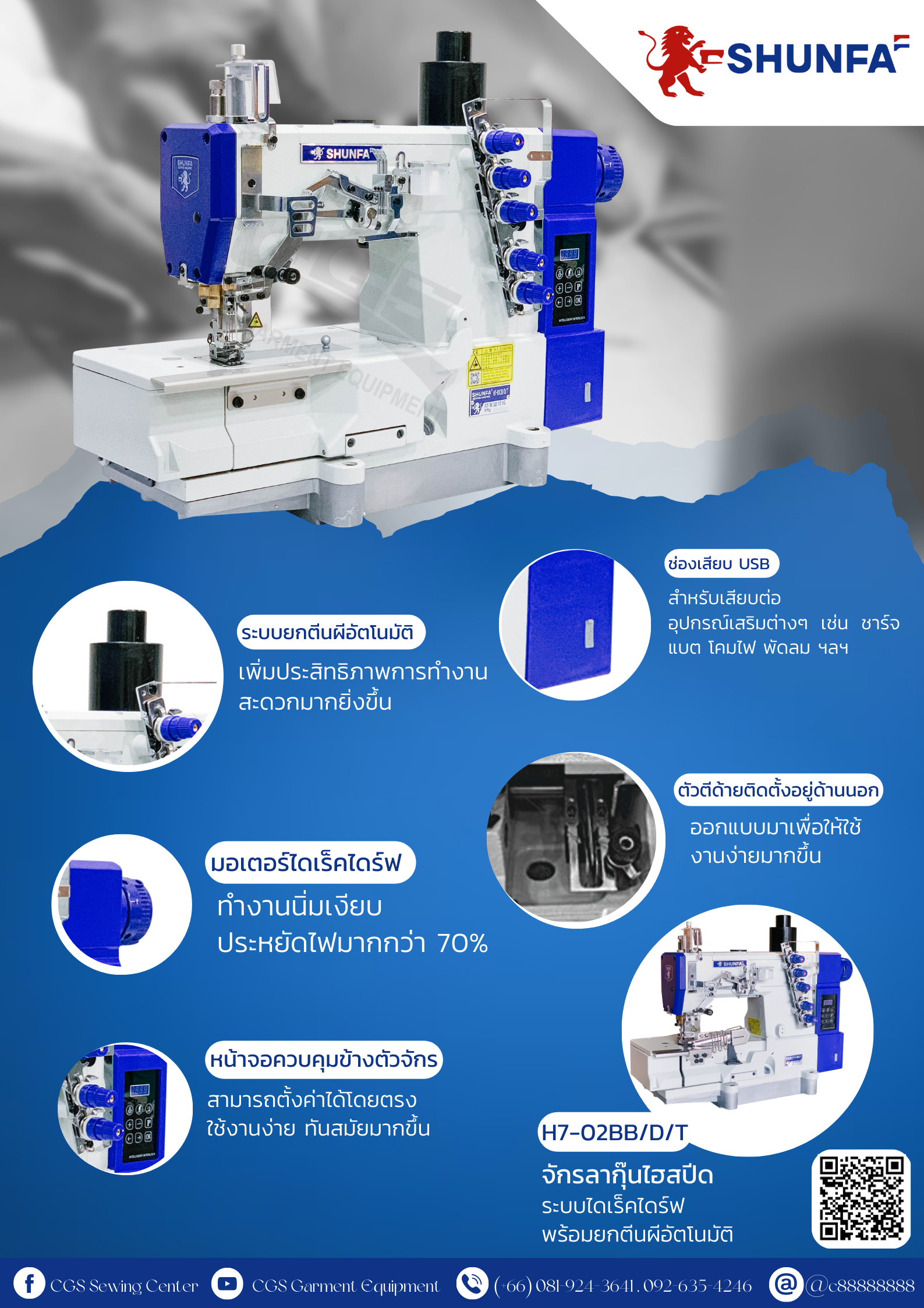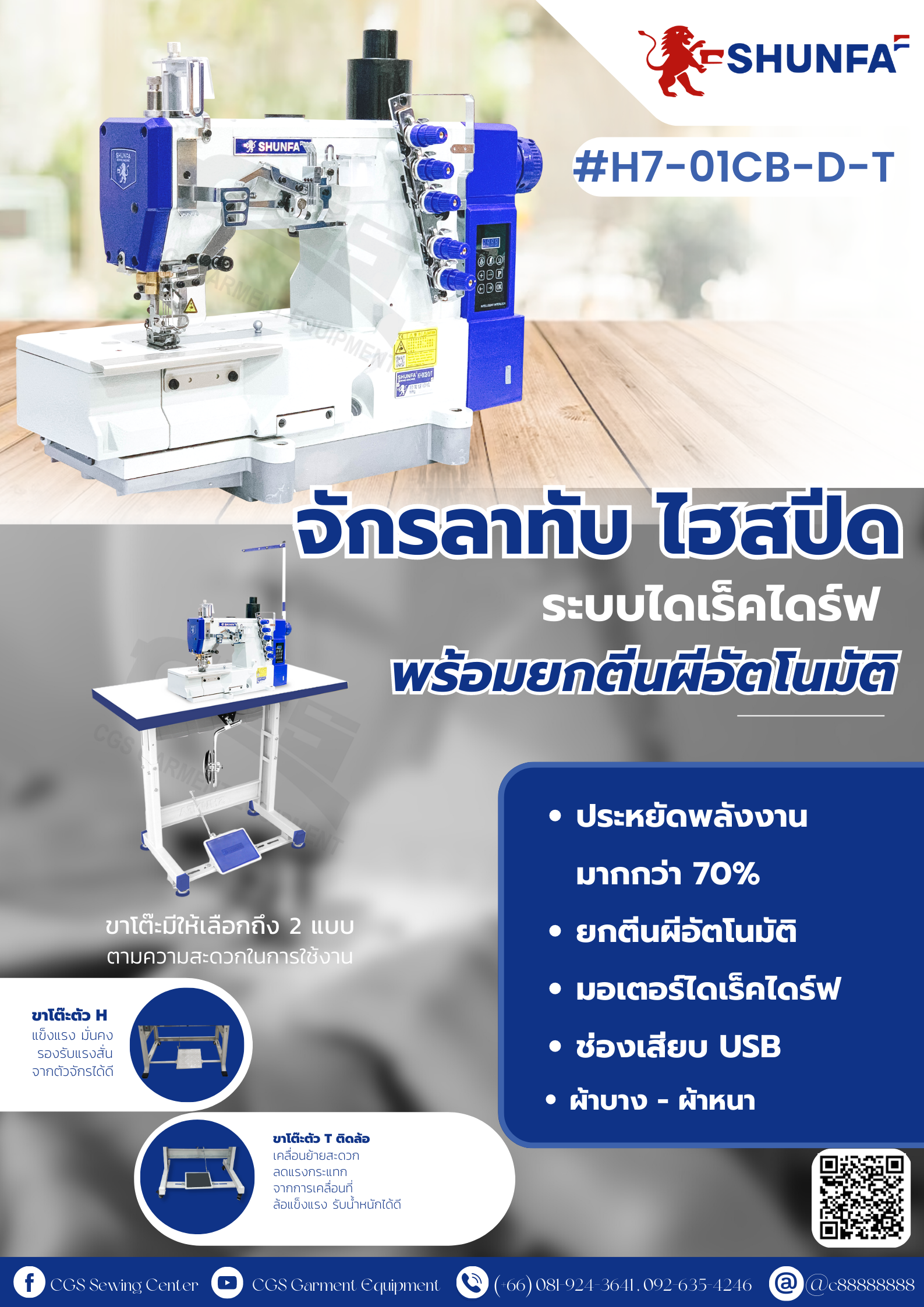 SHUNFA จักรลาทับ ไฮสปีด อุตสาหกรรม ระบบไดเร็คไดร์ฟ รุ่น H7-01CB/D/T พร้อมยกตีนผีอัตโนมัติ ประหยัดพลังงานมากกว่า 70% เหมาะสำหรับผ้าบาง - ผ้าหนา