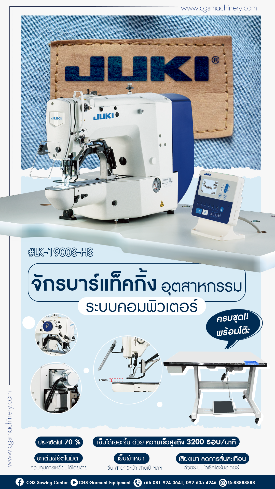 JUKI จักรเย็บ บาร์แท็คกิ้ง อุตสาหกรรม ระบบคอมพิวเตอร์ สำหรับ ผ้าหน้า รุ่น LK-1900S-HS จักรประหยัดไฟ เหมาะสำหรับ เย็บงานหนา เช่น สายกระเป๋า สายเป้ ฯลฯ