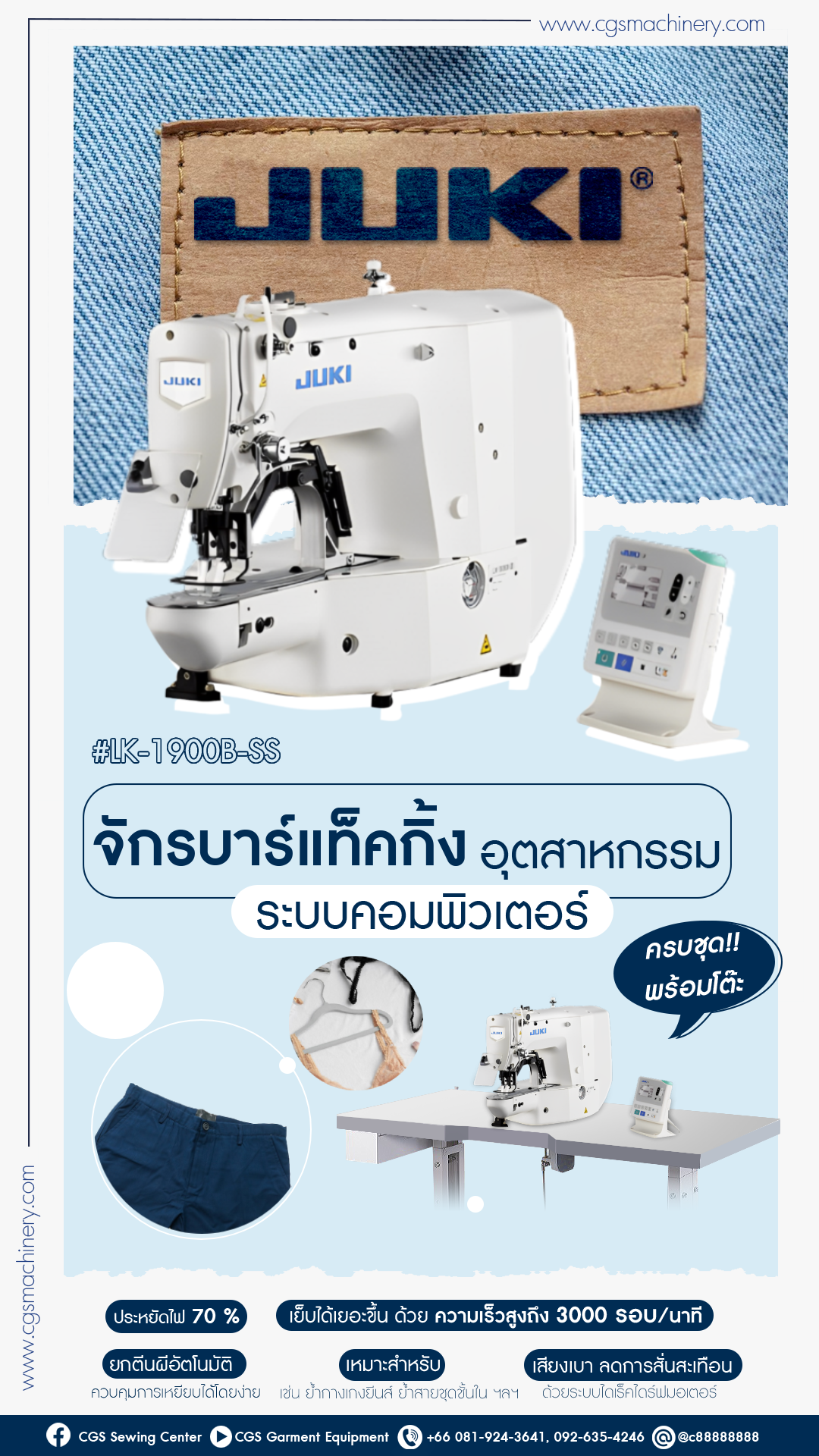 JUKI จักรเย็บ บาร์แท็คกิ้ง อุตสาหกรรม ระบบคอมพิวเตอร์ รุ่น LK-1900B-SS จักรประหยัดไฟ เหมาะสำหรับ ย้ำกางเกงยีนส์ ย้ำสายชุดชั้นใน ฯลฯ
