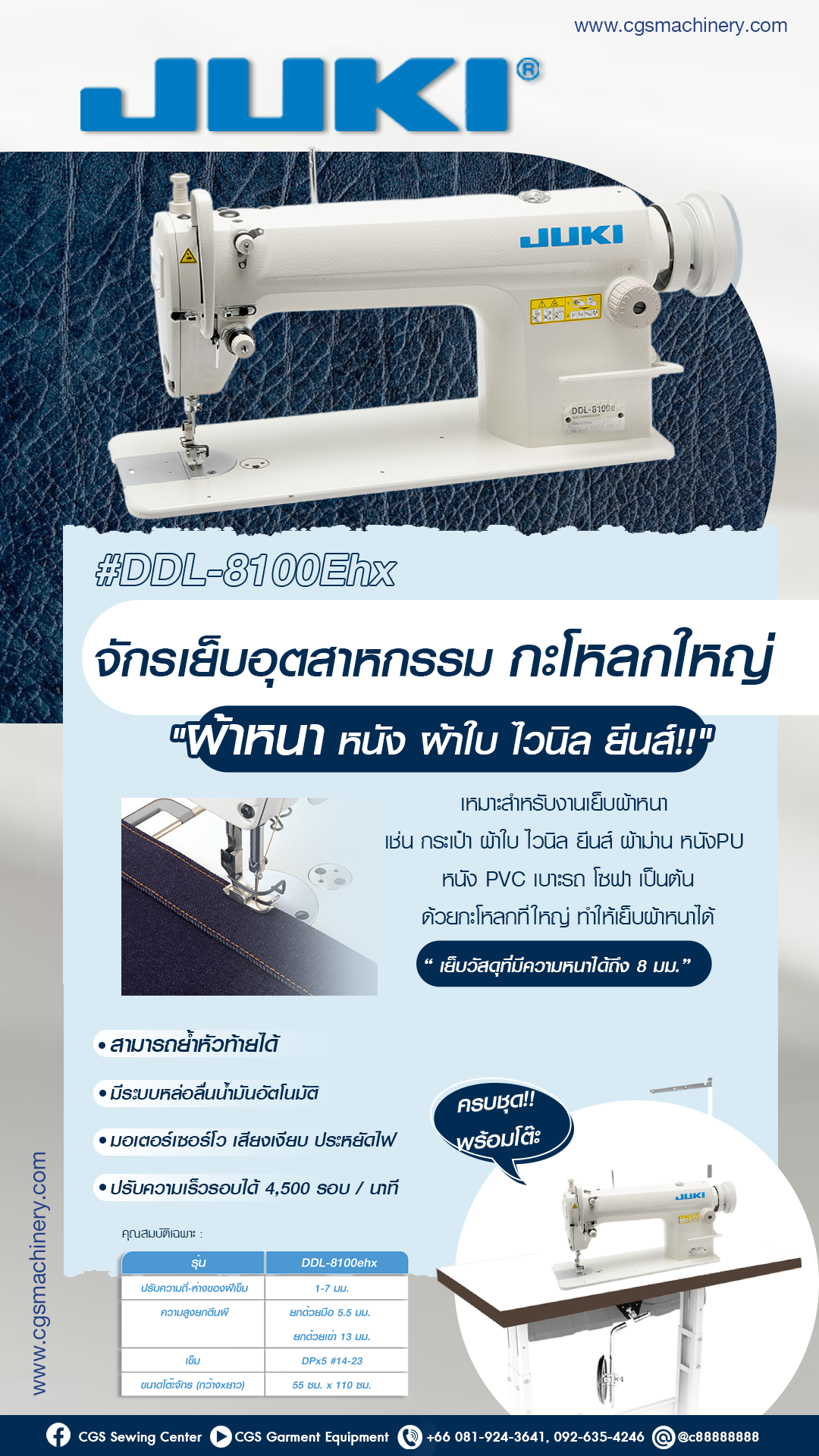 JUKI จักรเย็บกะโหลกใหญ่ อุตสาหกรรม รุ่น DDL-8100EHX เหมาะสำหรับงานเย็บผ้าหนา เช่น กระเป๋า ผ้าใบ ไวนิล ยีนส์ ผ้าม่าน หนังPU หนัง PVC เบาะรถ โซฟา เป็นต้น เย็บวัสดุที่มีความหนาได้ถึง 8 mm