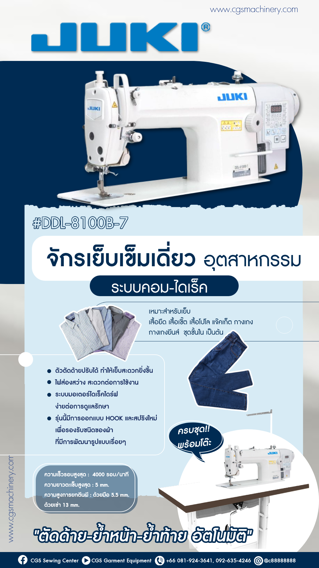 JUKI จักรเย็บเข็มเดี่ยว อุตสาหกรรม ระบบคอม-ไดเร็ค รุ่น DDL-8100B-7 เหมาะสำหรับเย็บ เสื้อยืด เสื้อเชิ๊ต เสื้อโปโล แจ๊คเก็ต กางเกง กางเกงยีนส์ ชุดชั้นใน เป็นต้น