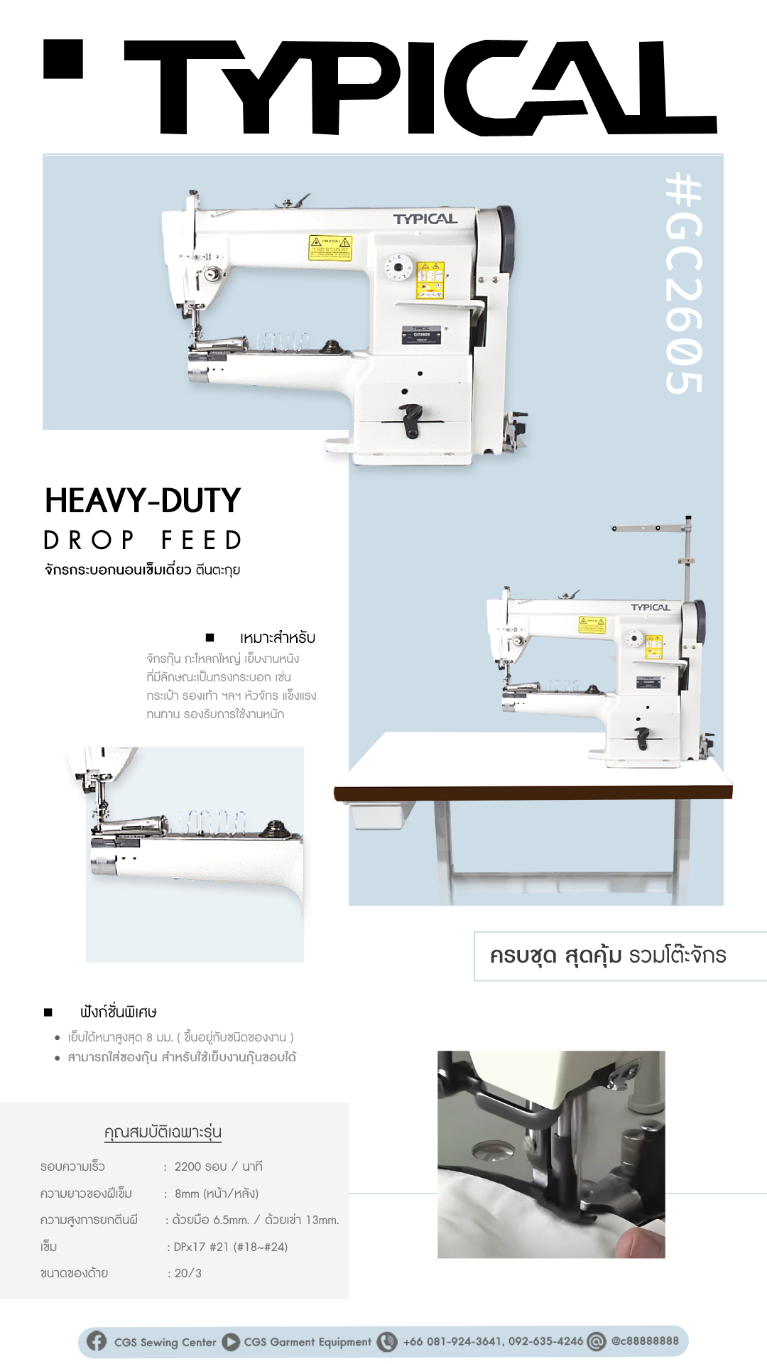 TYPICAL จักรกระบอกนอนเข็มเดี่ยว กะโหลกใหญ่ ตีนตะกุย อุตสาหกรรม รุ่น GC-2605 HEAVY-DUTY DROP FEED