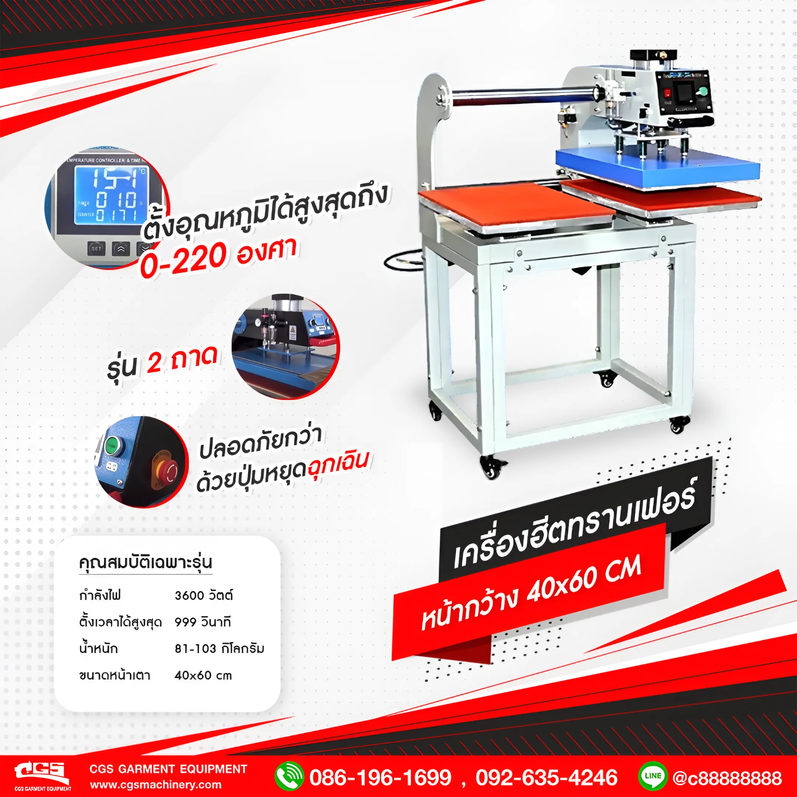 เครื่องฮีตทรานเฟอร์ 2 ถาด ขนาด 40x60 cm เครื่องรีดร้อน heat transfer - ตั้งอุณหภูมิได้สูงสุดถึง 0-220 องศา - ตั้งเวลาได้สูงสุดถึง 999 วินาที