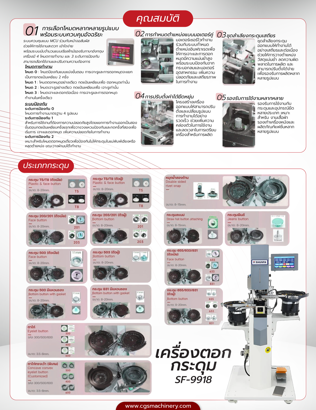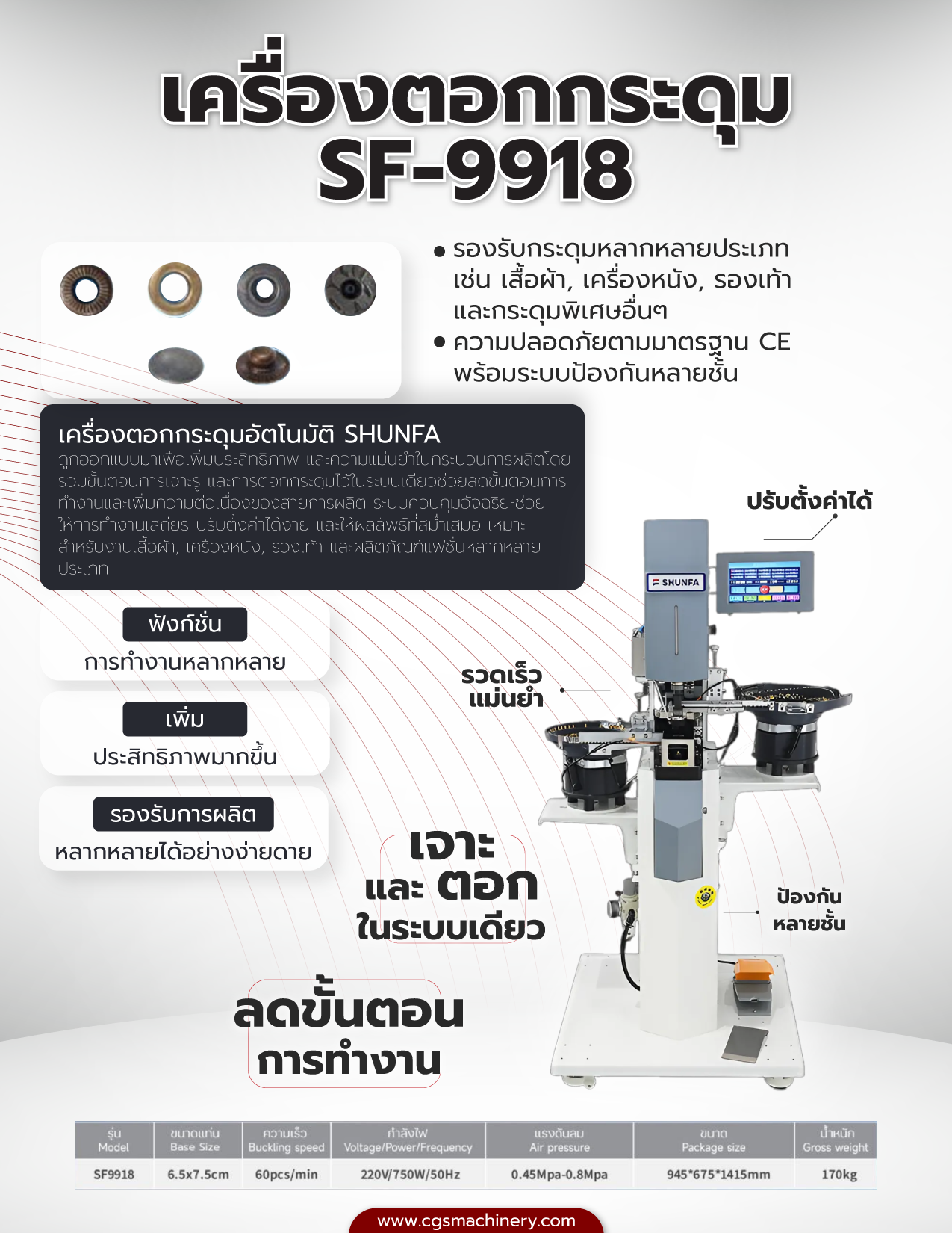 ใหม่! SHUNFA SF-9918 จักรตอกกระดุมอัจฉริยะ ระบบออโต้ SHUNFA " เหมาะกับงาน หลากหลายประเภทและใช้ได้กับกระดุมหลากหลายแบบ " รับรองความปลอดภัย ตามมาตรฐาน CE