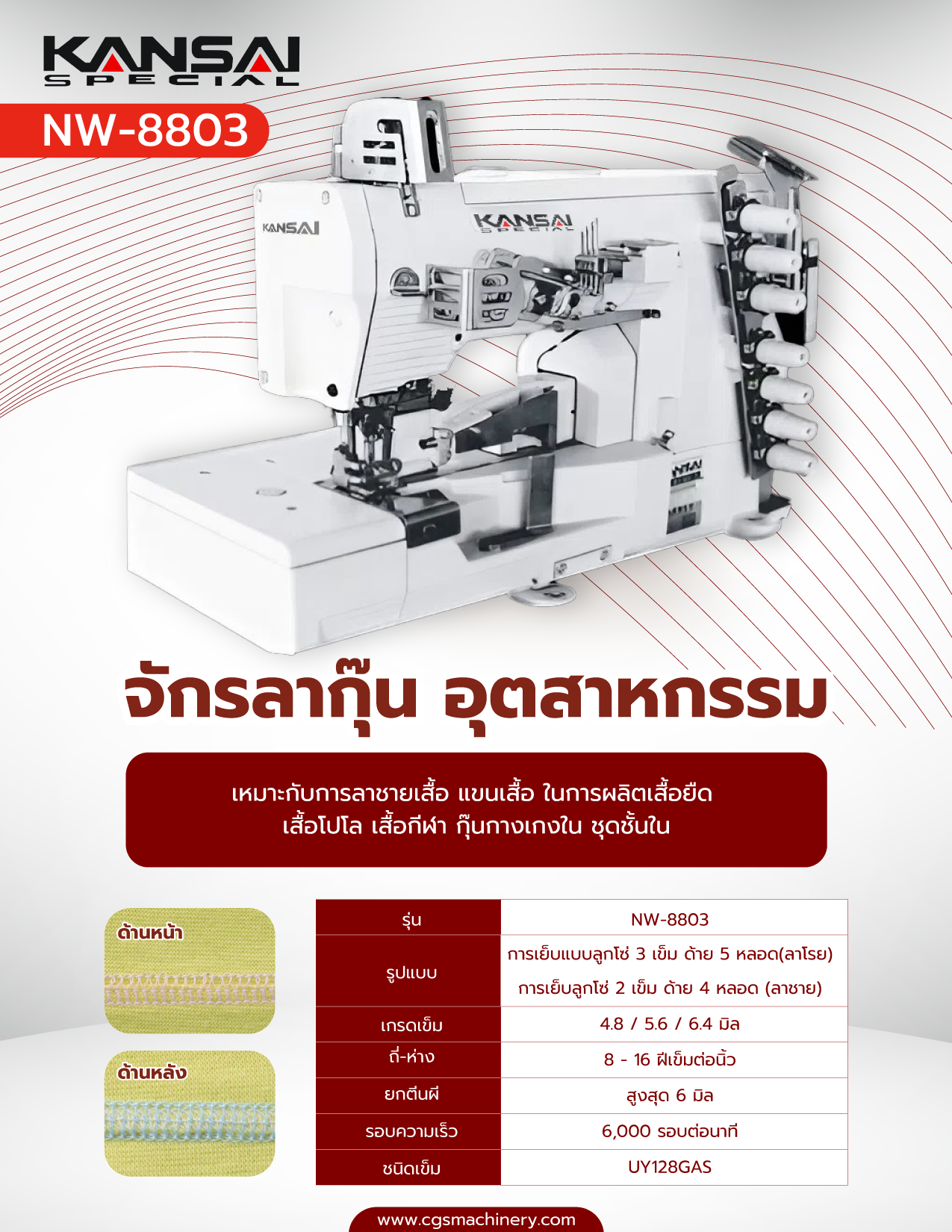 KANSAI จักรลากุ๊น อุตสาหกรรม ลาผ้ายืด เย็บผ้ายืด 3 เข็ม รุ่น NW-8803 จักรลาผ้ายืด, เย็บผ้ายืด สำหรับลาชายเสื้อ แขนเสื้อ กุ๊น กางเกงใน ชุดชั้นใน เสื้อยืด เสื้อโปโล เสื้อกีฬา ฯลฯ